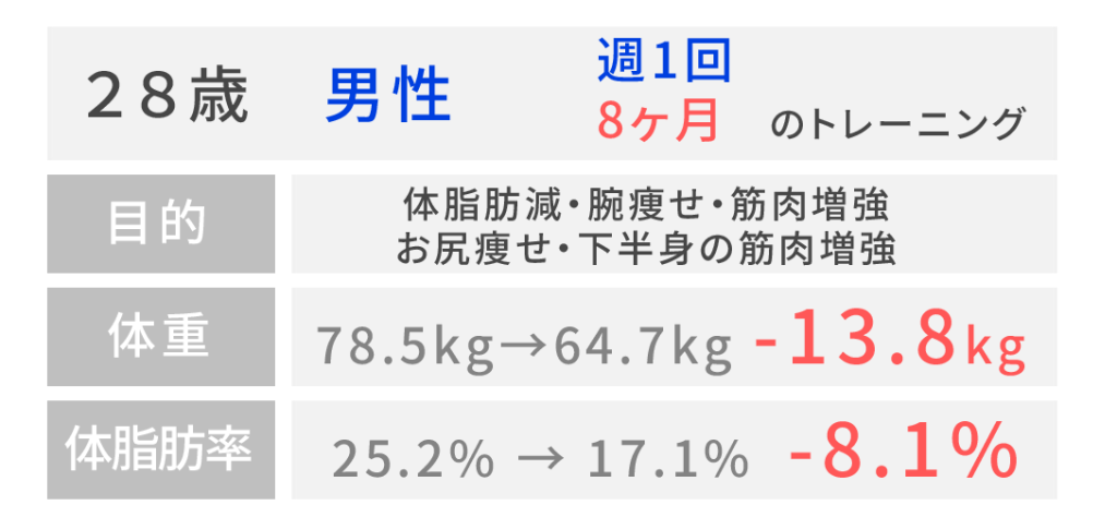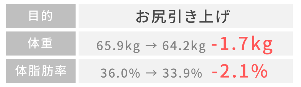 2ヶ月で‐3kgの結果でしたが、数字以上に見た目が大きく変わり、家族や友人から変わったねと言われるようになりました!